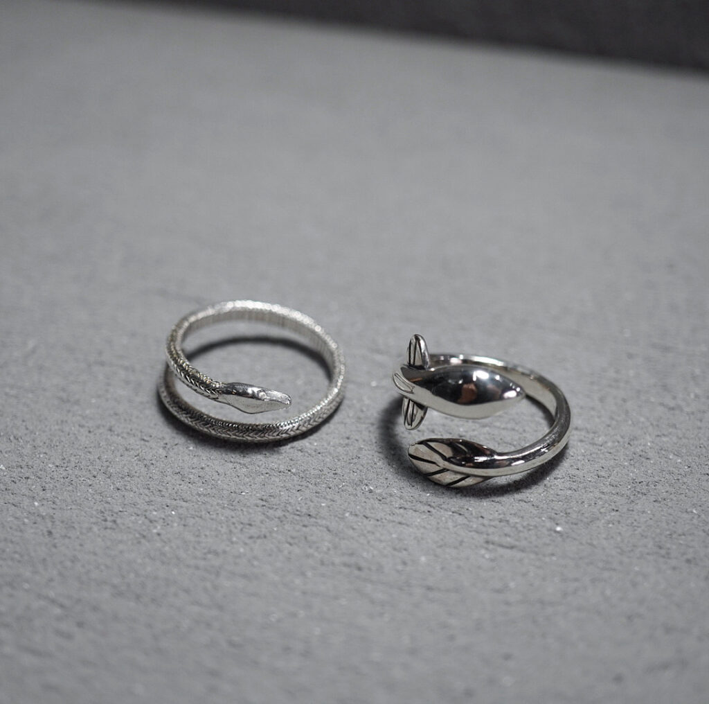 ▼モチーフリング〈左:蛇 右:鰻〉