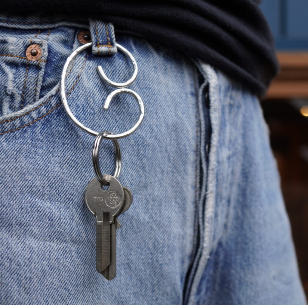 当初は発案者の名前に由来して『Marc Twist マークツイスト』と呼ばれていましたが、ジーンズのベルトループにキーリングを引っ掛ける様子から、ジーンリングという名称が付けられました。