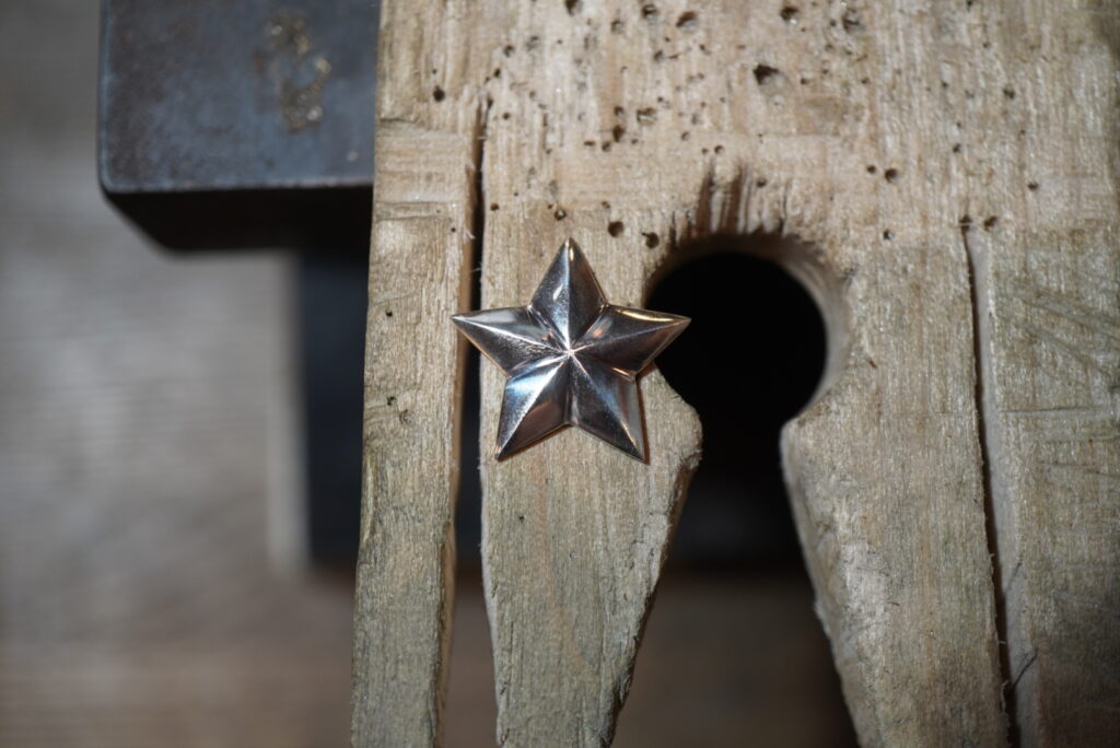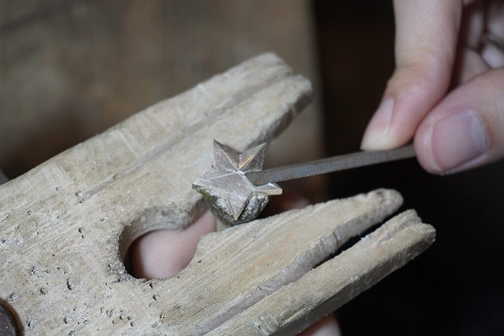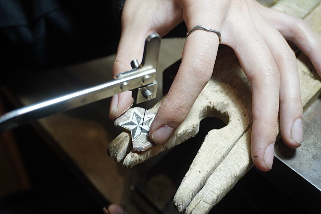 必要な厚みになる様に機械で板を伸ばしたら、糸鋸で星形に切り出していきます